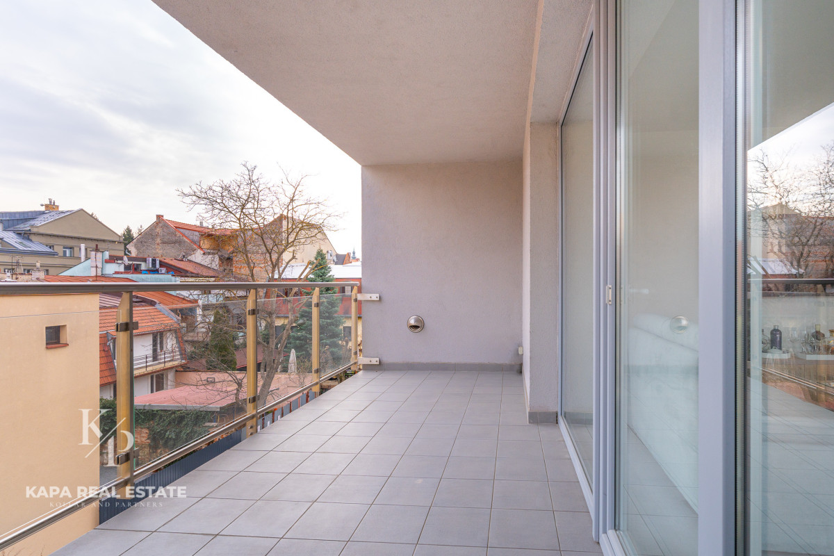 Exteriér: Veľkorysý balkón s výhľadom na centrum mesta ideálny na letné večery.